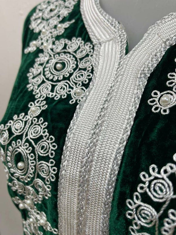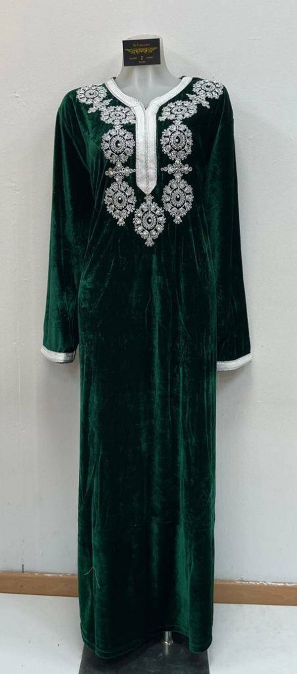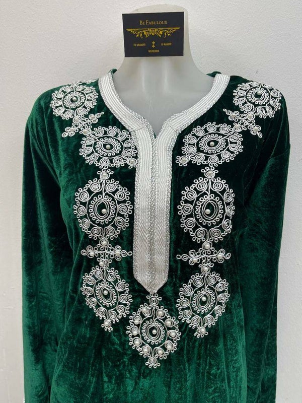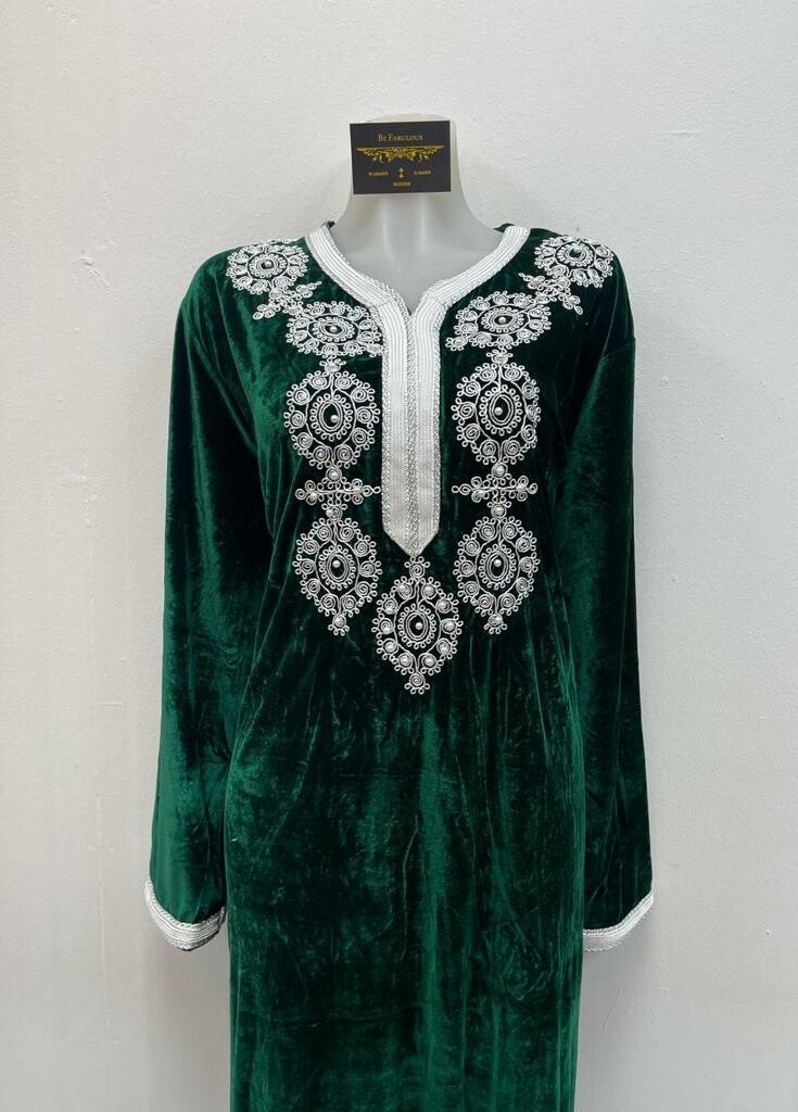 Velours kaftan met witte/zilveren borduursel. Verkrijgbaar in 5 verschillende kleuren en maten vanaf een M tot een XXXL