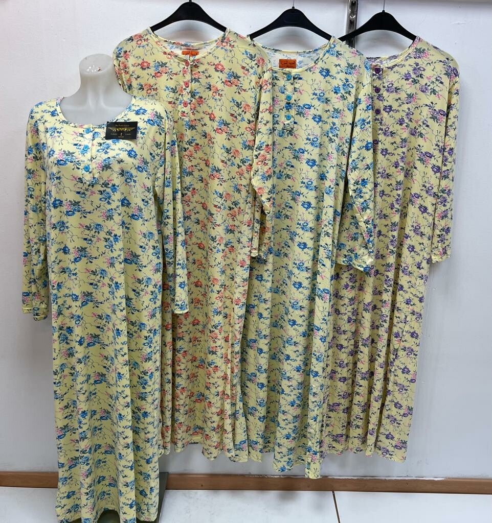 Katoenen huisjurk met knoopjes. Verkrijgbaar in het geel met blauwe, roze of paarze bloemen.