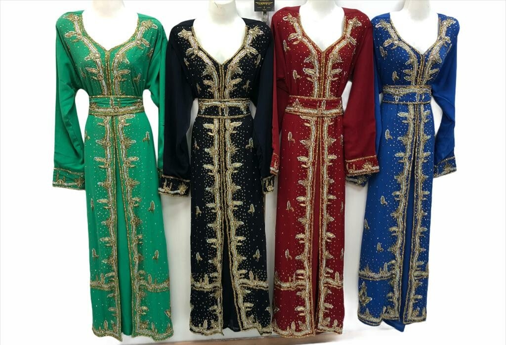 Takchita in verschillende kleuren. De jurken worden geleverd in standaard maat en zijn verstelbaar met behulp van de bijgeleverde riem. Ze passen iedereen vanaf maat M tot XXL.