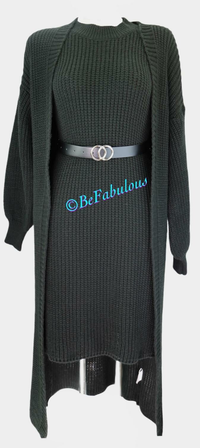 Warme truiset bestaande uit een mouwloze lange trui, lange bevest en design riem.